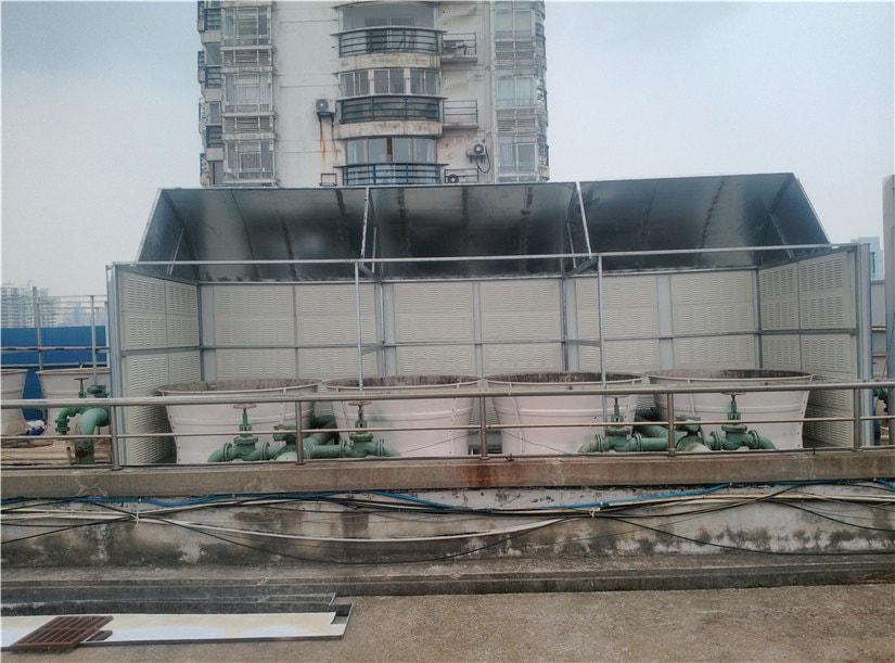 此項目中噪音主要表現(xiàn)為淋水噪音。在冷卻塔旁邊測得76db(A)。針對現(xiàn)場情況我公司在冷卻塔外一米處設(shè)置U字型聲屏障,保護(hù)居民聲環(huán)境的同時保證設(shè)備正常用風(fēng)。