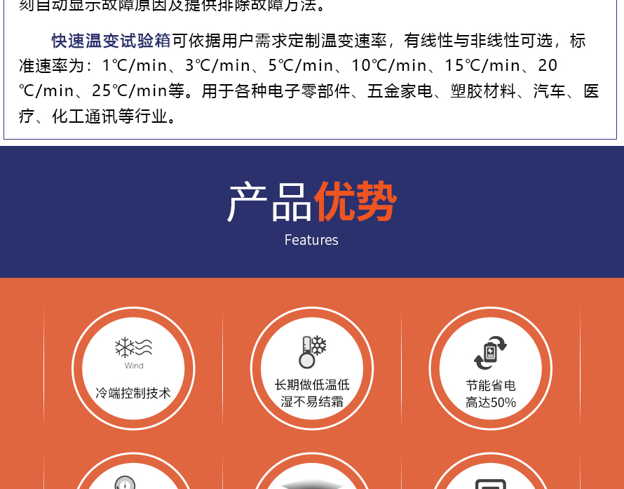 產品型號:JQESS-100 品牌:劍 喬 用途:快速溫變試驗箱主要用來測試各種材料耐熱、耐寒、耐干、耐濕的性能。本機采用中英文顯示彩色觸控式屏幕畫面,操作簡單,程序編輯容易,可顯示完整的系統操作狀況相關數據、執咨詢熱線:13829135130