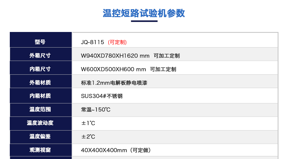 產(chǎn)品型號:JQ-8115(可定制) 品牌:劍 喬 用途:溫控型電池短路試驗(yàn)機(jī)綜合多種電池短路試驗(yàn)標(biāo)準(zhǔn)要求而設(shè)計(jì)按標(biāo)準(zhǔn)要求短路裝置必須符合內(nèi)阻范圍≤5mΩ從而獲得試驗(yàn)要求的最大短路電流咨詢熱線:13829135130