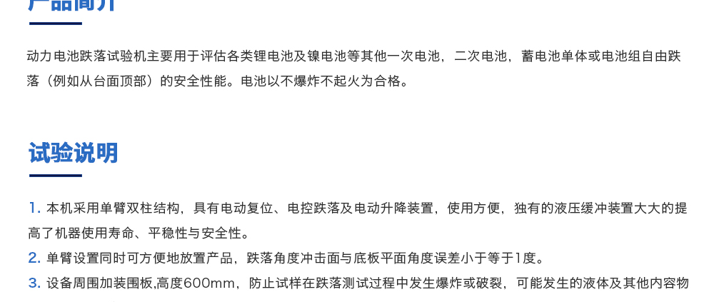 產品型號:JQ-315ST 品牌:劍 喬 用途:動力電池跌落試驗機主要用于評估各類鋰電池及鎳電池等其他一次電池,二次電池,蓄電池單體或電池組自由跌落(例如從臺面頂部)的安全性能。電池以不爆炸不起火為合格。咨詢熱線:13829135130
