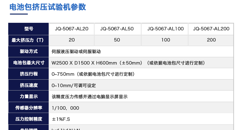 產(chǎn)品型號:JQ-5067-AL20 品牌:劍 喬 用途:電池包擠壓試驗(yàn)機(jī)模擬各類動力動力電池包和系統(tǒng)在運(yùn)輸、儲存及使用過程中電池包遭受碰撞擠壓的情形,人工呈現(xiàn)電池在遭受擠壓時可能出現(xiàn)的不同狀況。咨詢熱線:13829135130